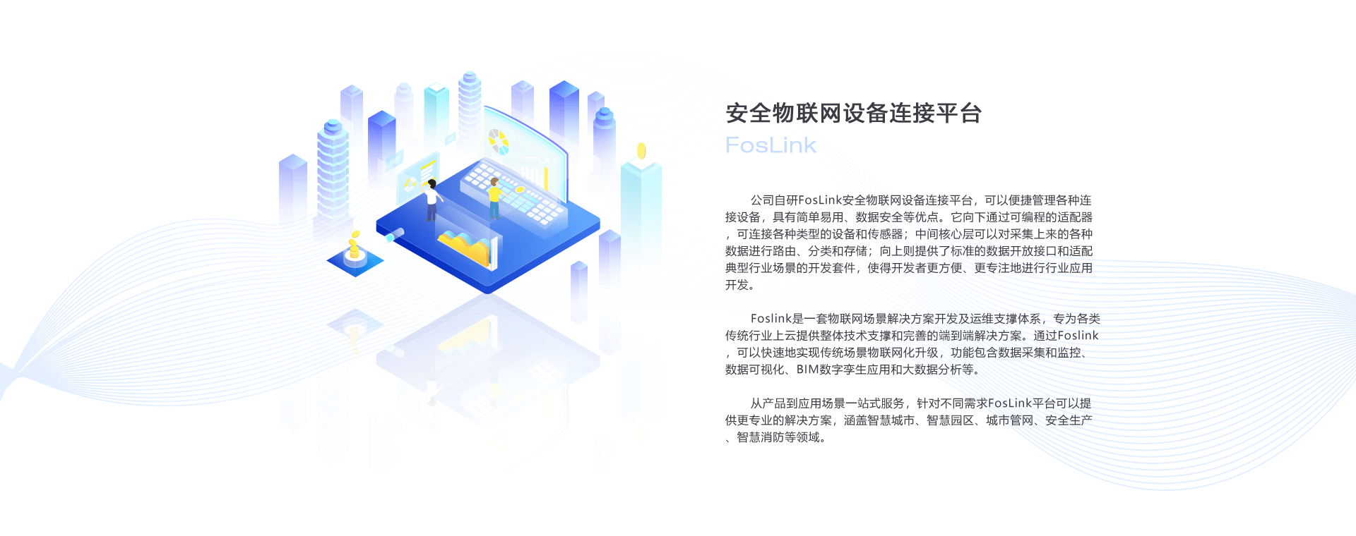 從產品到應用場景一站式服務,針對不同需求FosLink平臺可以提供更專業(yè)的解決方案,涵蓋智慧城市、智慧園區(qū)、城市管網、安全生產、智慧消防等領域。